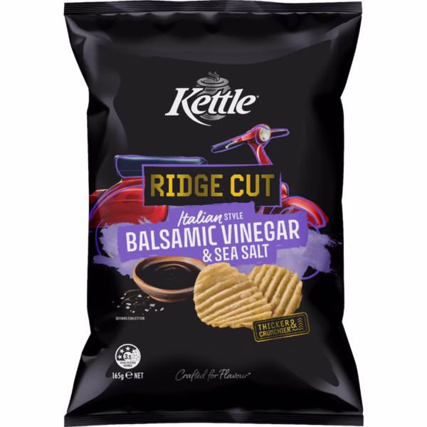 Kettle Ridge Cut Italian Balsamic Vinegar & Sea Salt, inspired by the sweet tangy taste of Italian style balsamic vinegar and sea salt and made from 100% Aussie potatoes. We hope you enjoy this rather special blend from Kettle. Kettle Chips are proudly Australian Made & Gluten Free. Our Herb & Spice Potato Chips are Vegan Friendly* and 100% Natural. A great snack choice for entertaining! *We don’t use any animal products in the preparation of these chips. Just so you are aware, they are cooked in the same facility as other products that are not vegan.