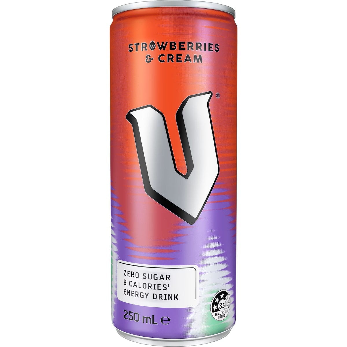 V Energy new candy flavours energy drink range – full-on flavour and zero apologies – zero sugar – low calorie. Strawberries & Cream – tastes like a silky swirl of ripe strawberry and rich cream, only 8 calories.